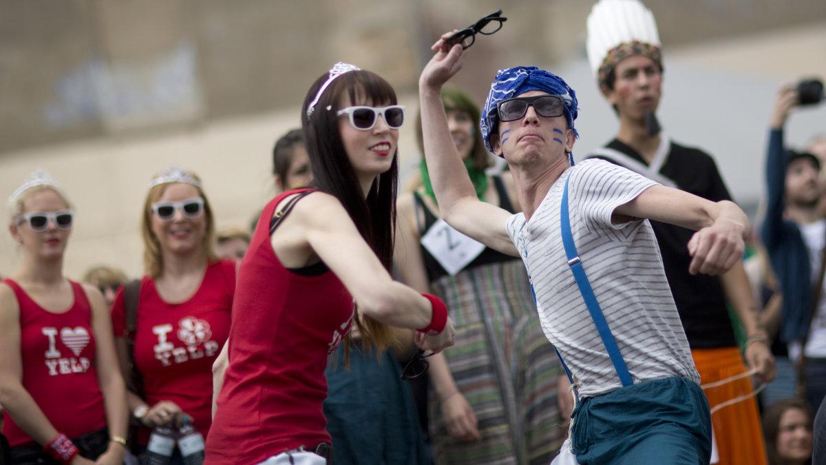 dapdParticipants of the "Hipster Olympiade" (Hipster Olympics) throw horn-rimmed glasses in Berlin, Germany, Saturday, July 21, 2012. The organizers of the competition want to revive the Hipster subculture of the 1990s in a sporting contest consisting of