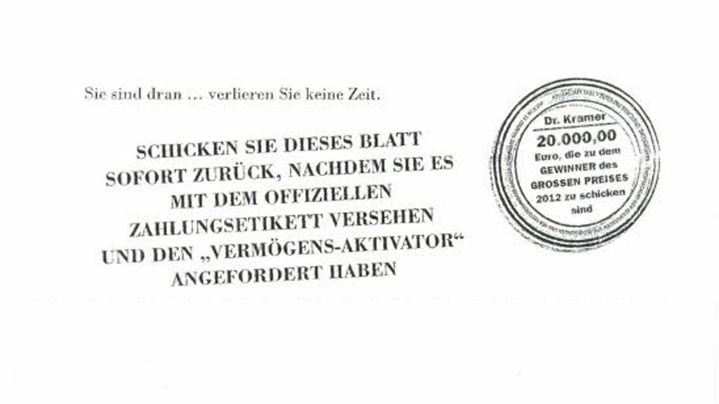 Neben den 20.000 Euro, die jeder Empfänger "sicher" bekomme, gebe es auch einen Vermögensaktivator zu kaufen. "Man muss 40 Euro in den Bestellumschlag stecken oder 45 für eine Expresslieferung und dann bekommt man die 20.000 Euro und den Ratgeber", sagt Schreiber. Dr. Kramer verspricht darin, das Geheimnis zur Vervielfachung von Geld zu offenbaren. "Zahlreiche weltweit berühmte Multimillionäre hätten seine Methode angewendet", referiert Schreiber. Für Skeptiker habe der vermeintliche Doktor auch noch Tipps: "Regen Sie sich nicht auf und bleiben Sie ruhig. Geben Sie die Sache nicht bekannt."
