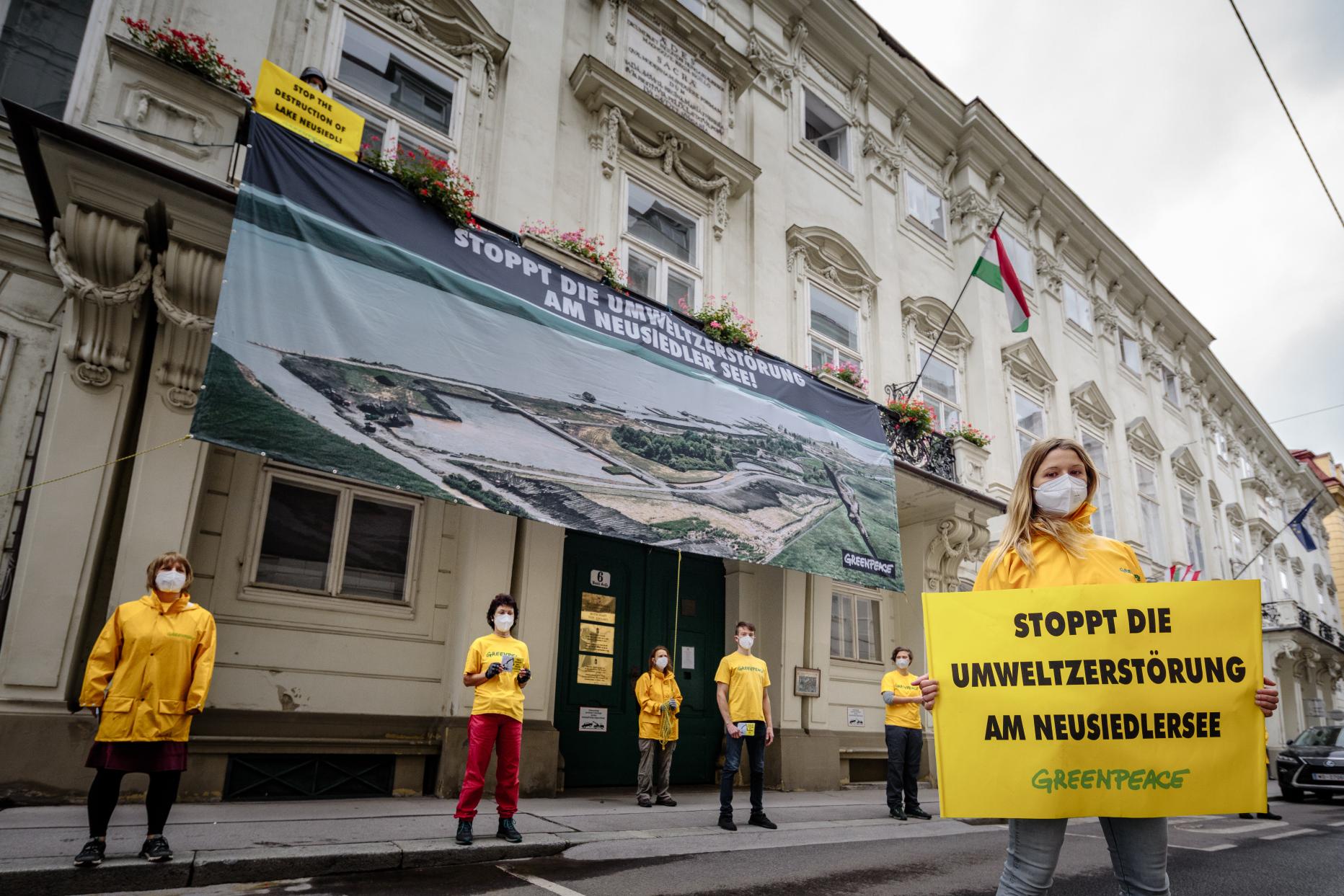Im Zuge der Greenpeace-Aktion haben drei AktivistInnen den Balkon der ungarischen Botschaft besetzt und dort ein großes Transparent mit der Aufschrift “Keine Umweltzerstörung am Neusiedlersee” fixiert. Die AktivistInnen fordern einen sofortigen Baustopp in Fertőrákos.