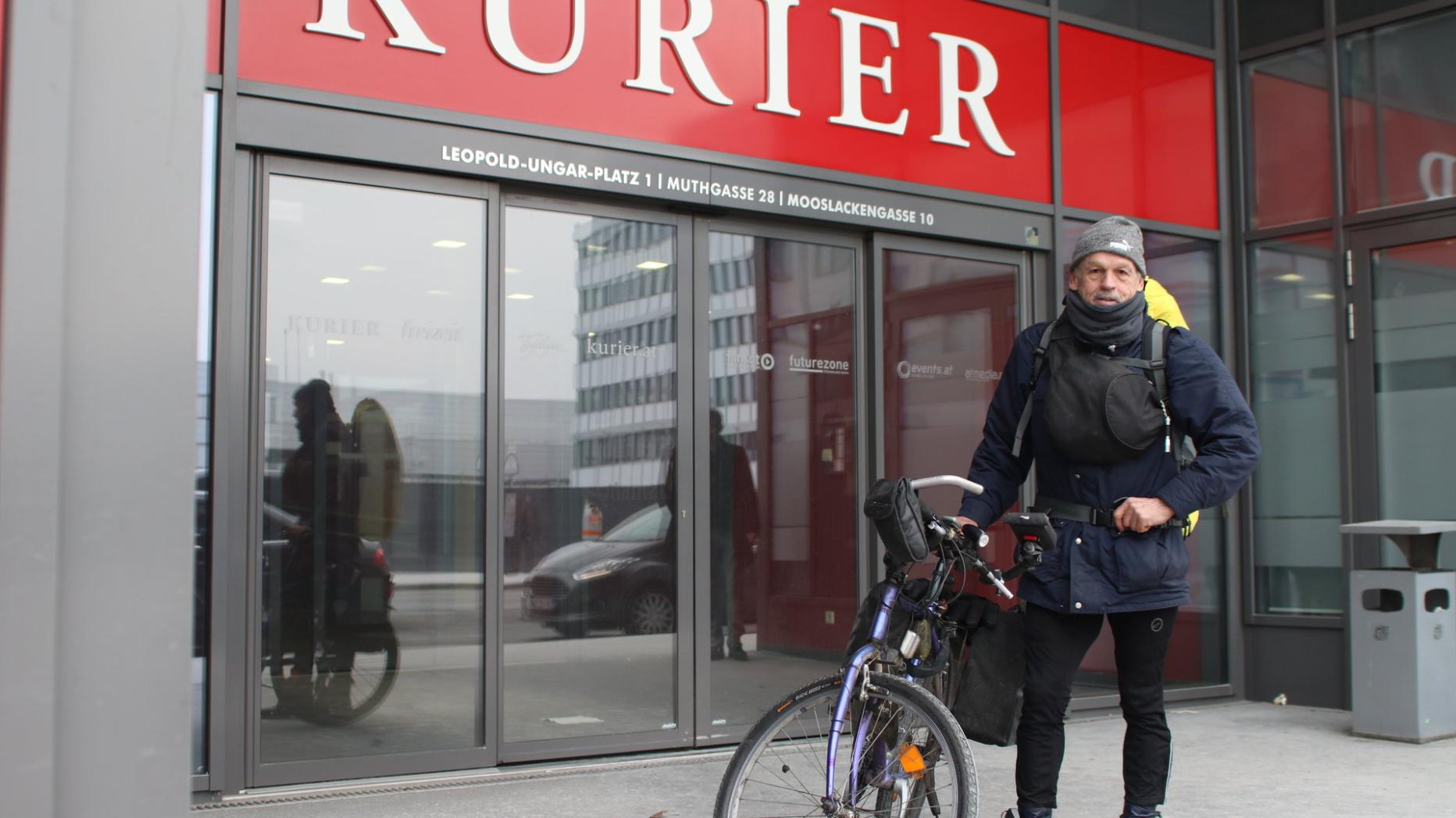 Dick eingepackt steht Helmut Haberfellner aus Karlsdorf, Bezirk Hollabrunn, mit seinem Fahrrad im Eingangsbereich des KURIER-Medienhauses. Auf seinem 2000 Kilometer langen Weg nach Rom hat der 65-jährige Ex-Feuerwehrmann einen kleinen Zwischenstopp in Wien-Heiligenstadt eingelegt.