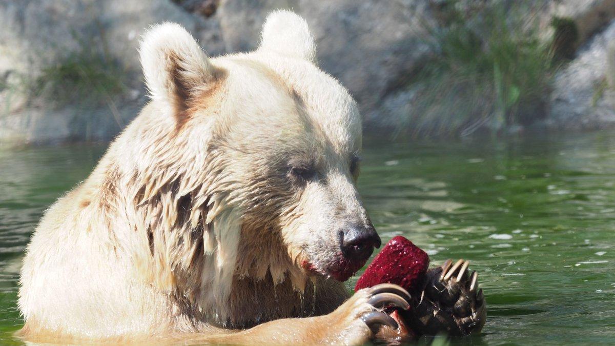 Bärin "Liese" kühlte sich mit gefrorenem Marmelade-Snack den Kopf. Plus: Weitere Tiere, die sich abkühlen.