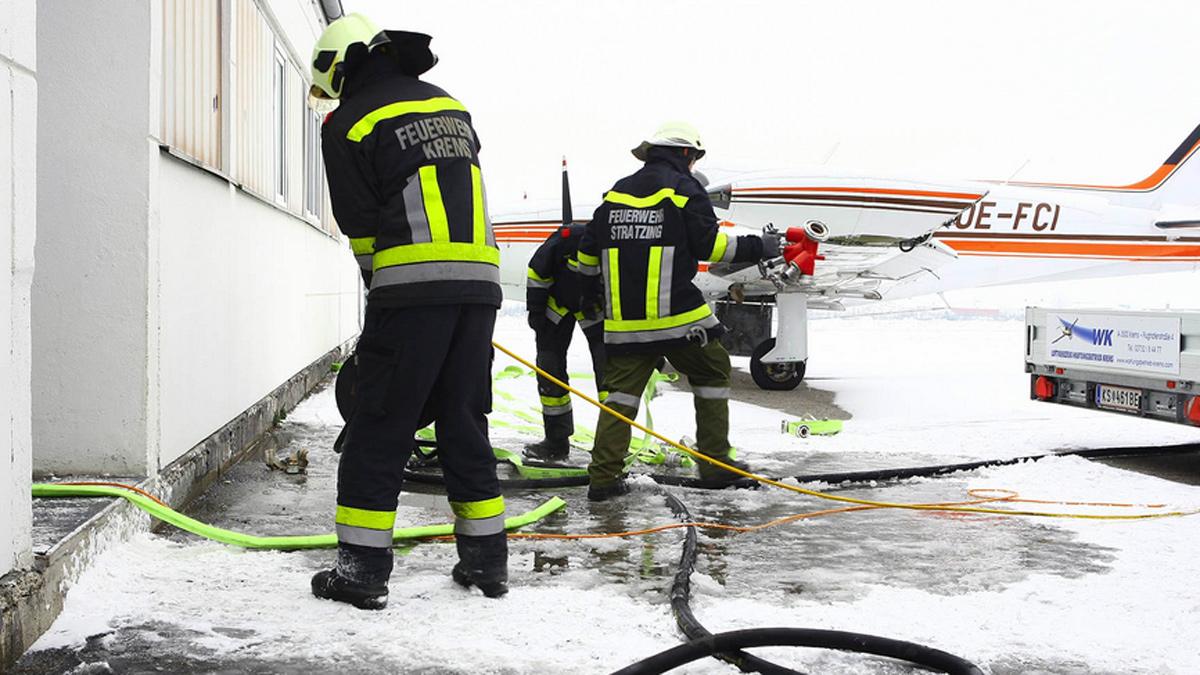 Gegen 7.45 Uhr waren mehrere Notrufe in der Bezirksalarmzentrale eingegangen. Die Einsatzkräfte konnten verhindern, dass sich das Feuer auf eine angrenzende Halle ausbreitet, in der Flugzeuge standen, berichtet der ORF Niederösterreich. Verletzt wurde niemand.