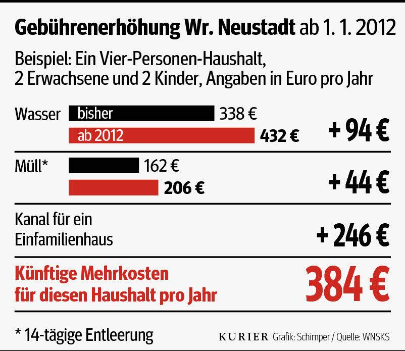 Rund 384 Euro für einen durchschnittlichen Vierpersonen-Haushalt. So teuer kommt den Wr. Neustädter Bürgern die Gebührenerhöhung ab 1. Jänner zu stehen. Die drastische Maßnahme ist Teil eines umfassenden Budget-Maßnahmenpakets, dass die SPÖ-Mehrheit erstmals zusammen mit der Volkspartei am 7. Dezember beschließen wird.