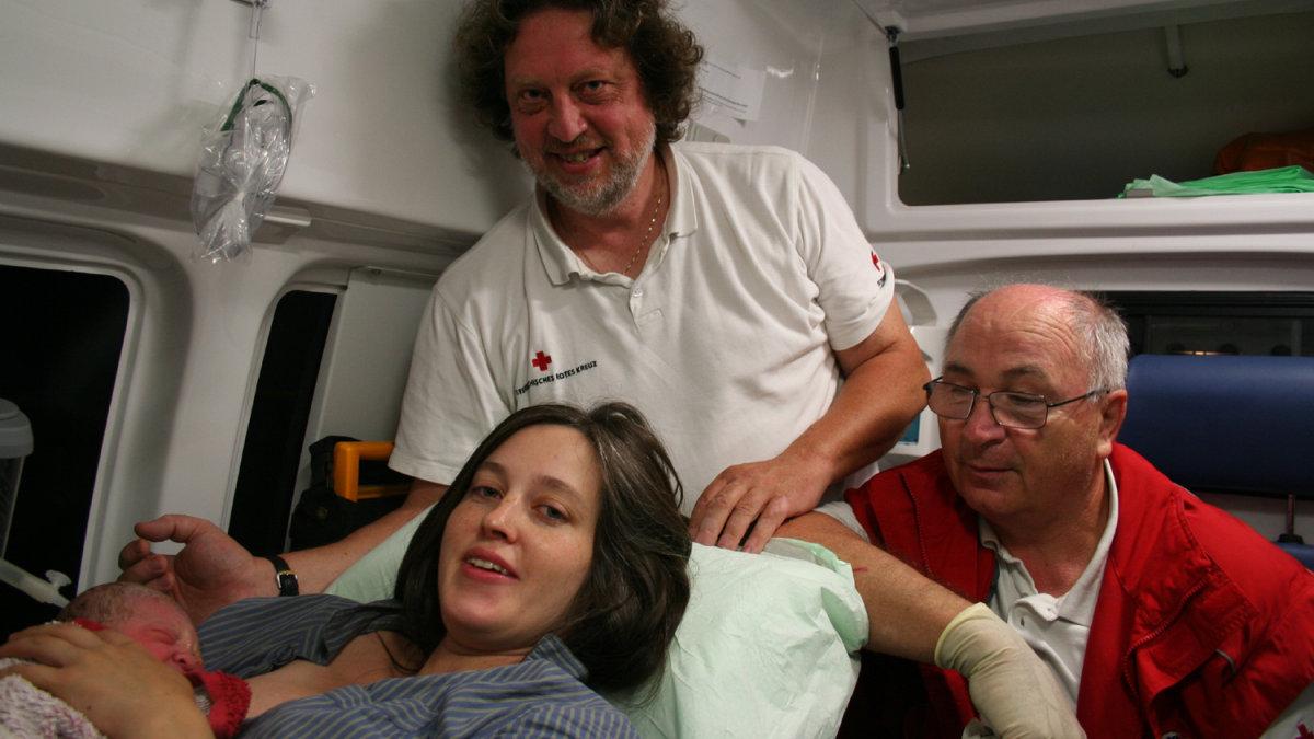 Zwei Rot-Kreuz-Sanitäter als Geburtshelfer für ein Baby. Mutter und Kind sind wohlauf.