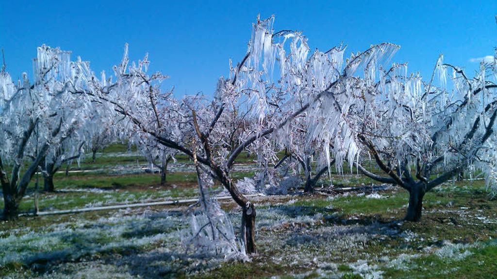 Das gezielte Besprühen von blühenden Obstkulturen mit sehr feinen Wassertröpfchen gilt auch heute noch als das sicherste Verfahren, um Blüten vor Frost zu schützen. Am Osterwochenende sanken die Temperaturen in der Nacht vielerorts (hier im Marchfeld) weit unter null Grad ab. Um massive Ernteausfälle zu verhindern, setzten deshalb die Obstbauern – sofern möglich – ihre Beregnungsanlagen in Betrieb. Beim Gefrieren des verteilten Wassers wird auf den Pflanzen Wärme freigesetzt, die sowohl Blätter als auch Blüten vor Frostschäden bewahrt.