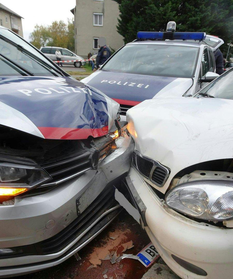 Der 29-Jährige, der den Wagen in einem Halteverbot abgestellt hatte, hatte sich einer Kontrolle entzogen und war davongerast. Bei der Flucht Richtung Eggendorf stellte sich ein Streifenwagen in einem Kreisverkehr als Sperre auf. "Der Lenker hat den Kreisverkehr entgegen der Fahrtrichtung durchfahren, Fahrzeuge mussten ausweichen", sagte Polizeisprecher Walter Schwarzenecker. Der Mann sei gegen das Einsatzfahrzeug gestoßen. Auf der Hauptstraße in Eggendorf konnte er gestoppt werden, es kam es zur Kollision mit zwei Polizeiautos.