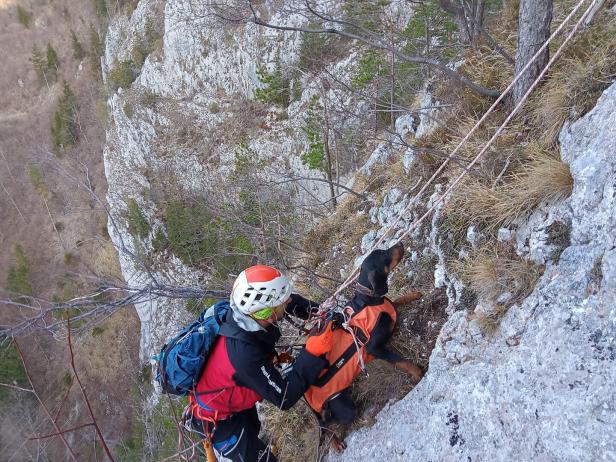 In einem außergewöhnlich aufwendigen und zeitraubenden Einsatz retteten Mitglieder der Bergrettung Reichenau (Bezirk Neunkirchen) einen in eine steile Felswand abgestürzten jungen Jagdhund.