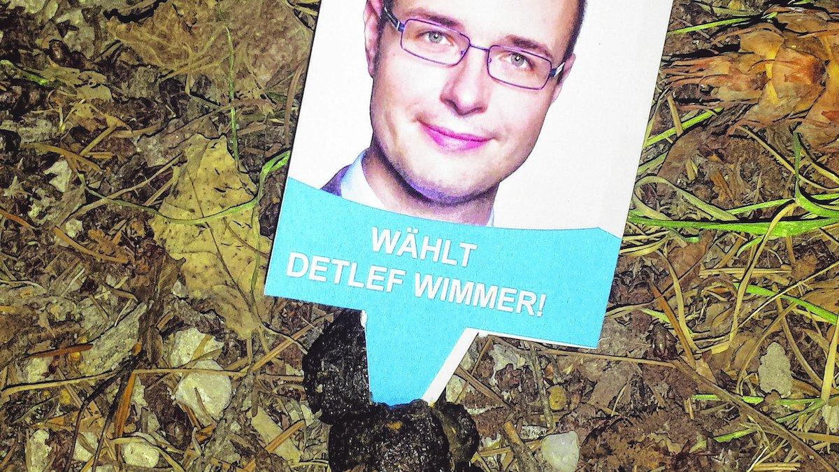 Gefälschte Wahlsticker des Linzer FPÖ-Kandidaten Detlef Wimmer werden in Hundehaufen platziert. Stadtrat vermutet Aktivisten des linken Spektrums als Täter.