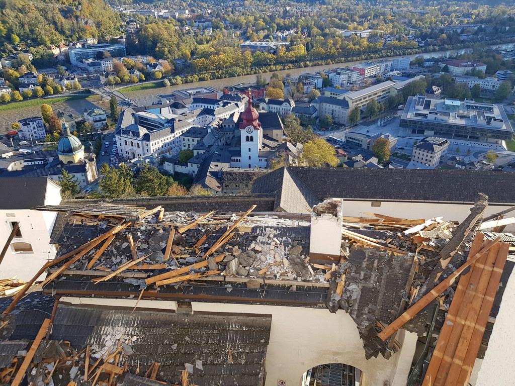 Die Holzschalungen und die Eternitschindel stürzten auf die darunterliegenden Gebäude, in den Burghof, auf Fußwege und auf die Trasse des Reißzuges. Die abgetragenen Dachteile rissen alte Kamine mit, am Festungsberg knickte die Sturmwalze mehrere Bäume. "Zum Glück haben sich am Morgen noch keine Mitarbeiter und Besucher auf der Festung befunden", sagte Heil. Der Burgverwalter, der selbst auf Hohensalzburg lebt, wurde durch die anschlagenden Brandmelder im Dachstuhl auf den Vorfall aufmerksam. "Ich habe dann rasch gesehen, dass es sich nicht um einer Feuer gehandelt hat."