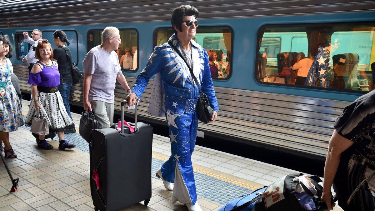 Elvis fans arrive at Central station to board a train to take them to The Parkes Elvis Festival from Sydney on January 12, 2017.