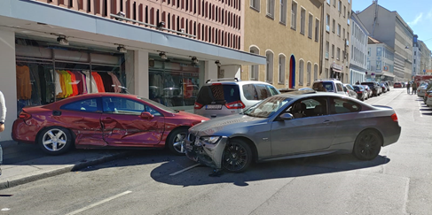 Durch die Wucht des Aufprall wurde das parkende Auto über den Gehsteig in die Auslagenscheibe eines Textilgeschäfts geschoben. Glücklicherweise befand sich gerade kein Fußgänger auf dem Gehsteig. Auch der 18-Jährige wurde bei dem Unfall nicht verletzt.