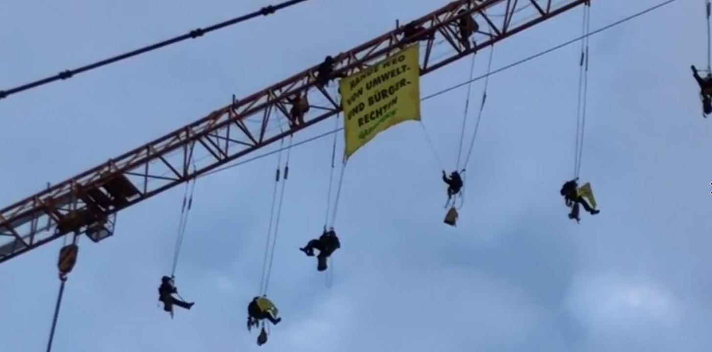 Die Umweltschützer seilten sich von dem Kran ab und entrollten in über 50 Meter Höhe Transparente.