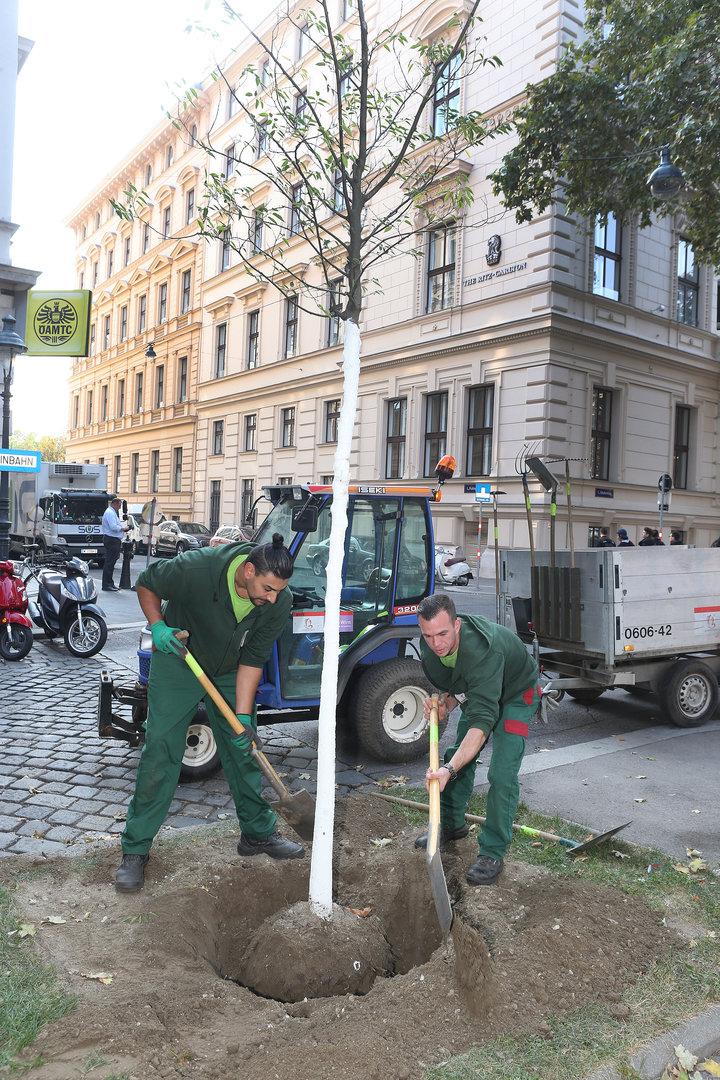 Die zwei Stadtgärtner befinden sich am Schubertring, auf Höhe der Fichtegasse, und sind dabei, einen Zürgelbaum (Celtis australis) einzusetzen. Einen von vielen. Denn Herbstzeit ist Baumpflanzzeit. Vor allem in Anbetracht der immer heißer werdenden Sommer ist es wichtig, dass die Bäume die Winterfeuchte nutzen können, um sich gut zu verankern. 3745 Bäume wurden vergangenes Jahr insgesamt in Wien gesetzt. Gerodet wurden im Gegensatz dazu 3676 Stück. Das entspricht der Norm. Generell werden stets ein wenig mehr gepflanzt als gerodet. Das liegt auch daran, dass Wien wächst.