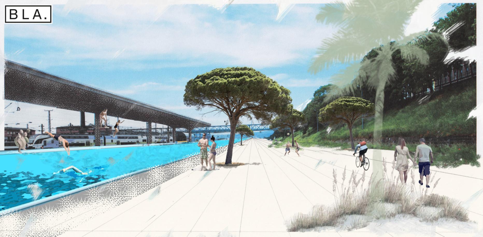 Ein Teil davon soll ein Pool sein - und zwar ein riesengroßer: Nicht weniger als die längste Schwimmbahn der Welt schwebt der Initiative vor. Entstehen soll das alles auf einer Fläche neben den Gleisen entlang der Felberstraße.