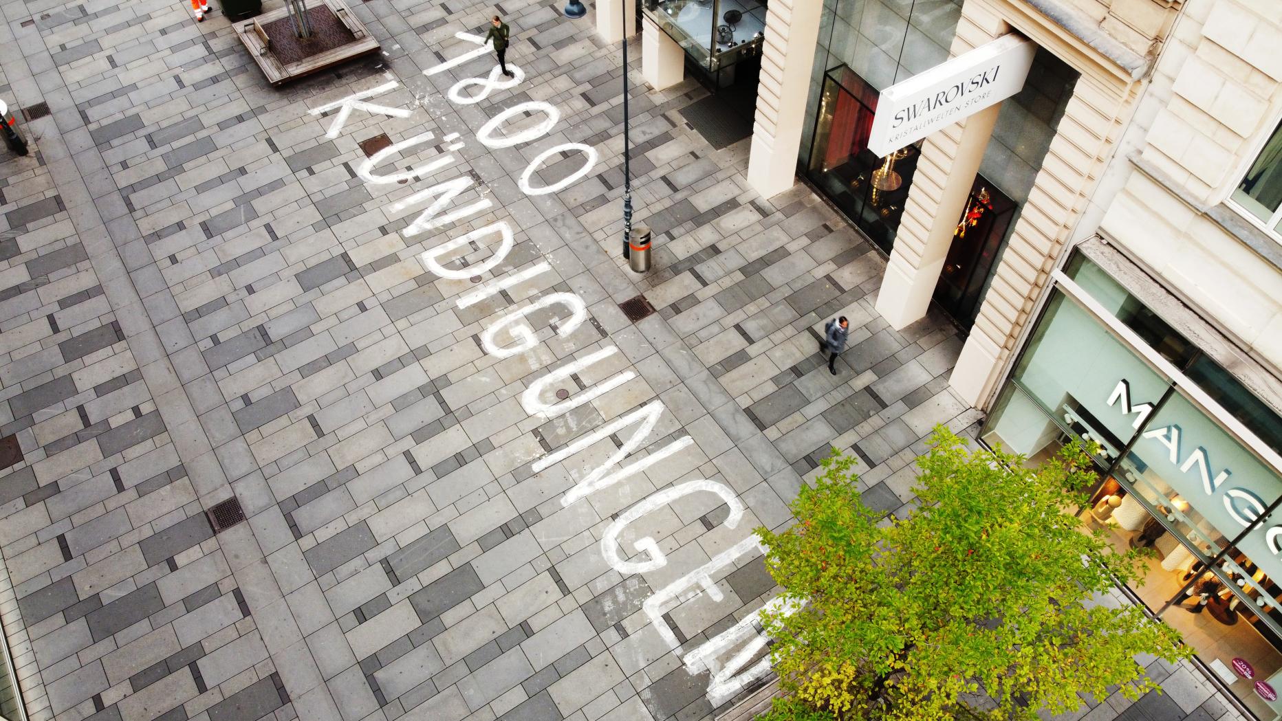 Bei zehn Unternehmen, die Corona-Staatshilfen in Anspruch genommen, trotzdem Mitarbeiter gekündigt und gleichzeitig Dividenden an ihre Aktionäre ausgeschüttet haben, malte "Links" meterhohe Schriftzüge auf den Asphalt.
