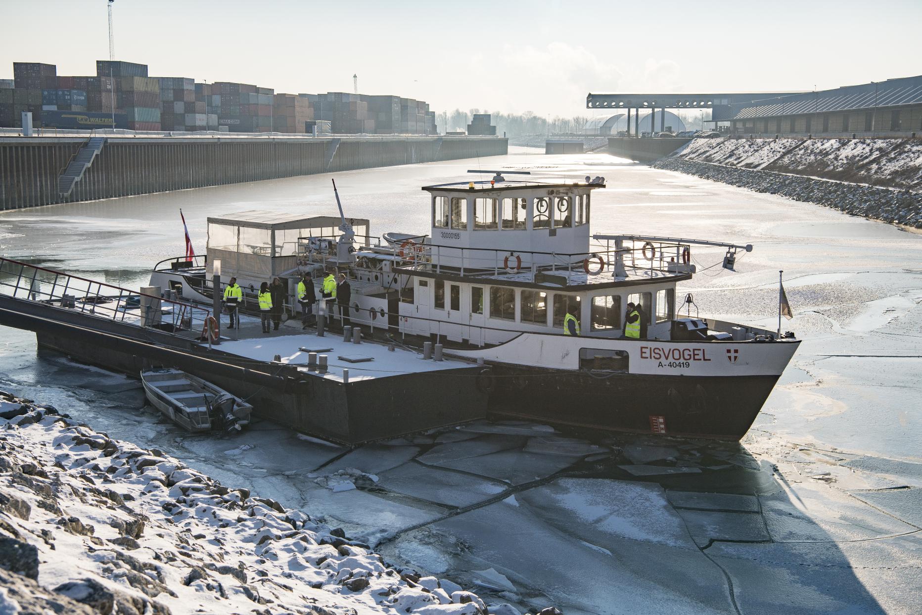 Erst knackt es, dann bildet sich ein langer Riss in der Eisdecke und schon entstehen lauter kleine Schollen, die vom Schiffsbug zur Seite geschoben werden. Im Schritttempo kämpft sich der Eisbrecher „MS Eisvogel“ Mittwochvormittag bei eisiger Kälte und Windstille durch das zugefrorene Hafenbecken in Freudenau. Nach fünf Jahren ist das Schiff unter der Leitung von Kapitän Wolfgang Steindl erstmals wieder im Einsatz.