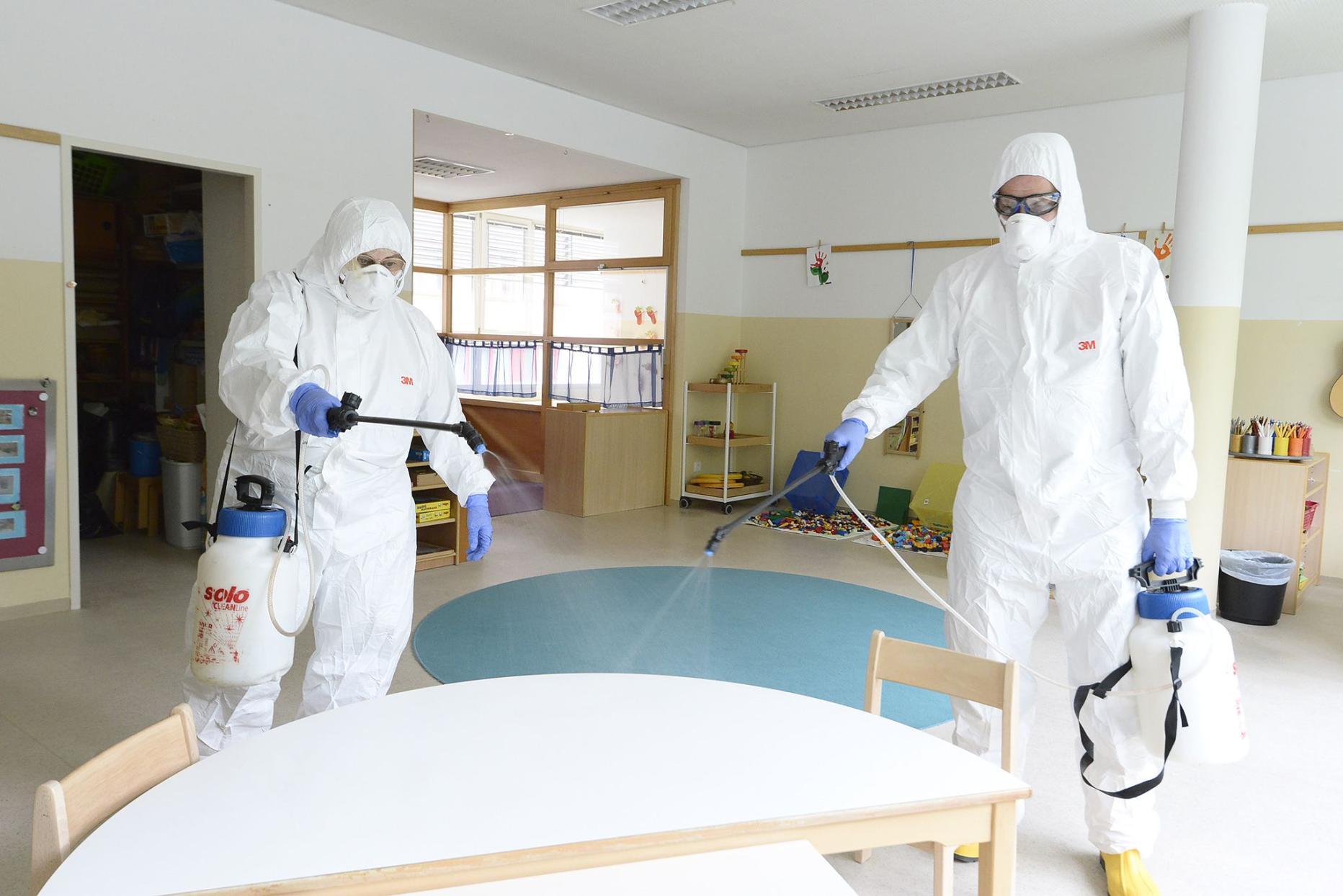 In weißen Overalls, mit Schutzmaske und Brille ausgestattet rückten Mitarbeiter des Hygienezentrums der Stadt Wien Donnerstagmittag in einem Kindergarten in Penzing an, um zwei Gruppenräume zu desinfizieren.