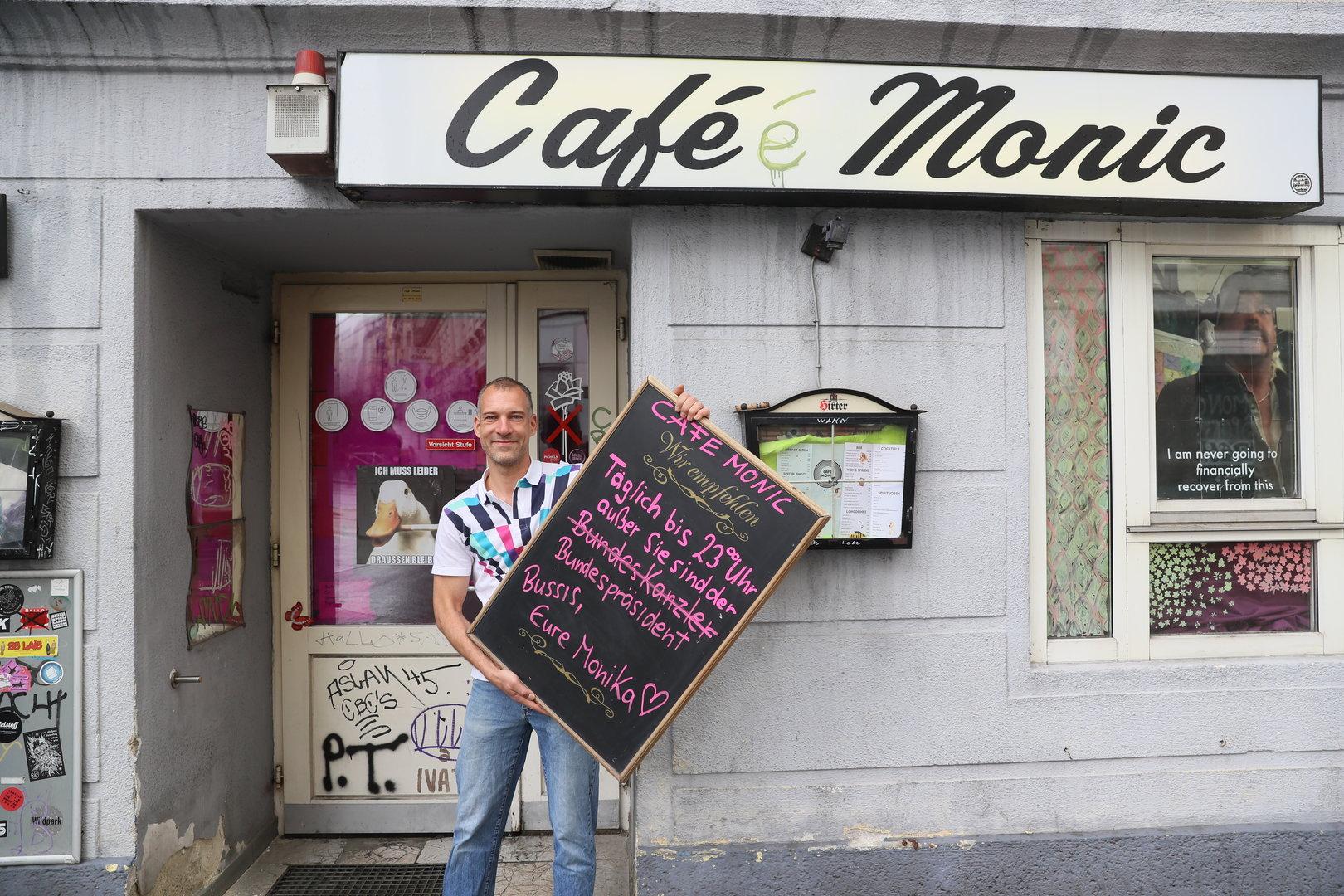 Die Monika gibt es nicht mehr, der Chef dort heißt jetzt Raphael und führt das Café Monic seit zwei Jahren. "Ich mag ja Van der Bellen eigentlich, aber so viel Fairness muss sein", sagt Raphael Frei. Der Bundespräsident ist ja nicht der einzige, der sich in der Corona-Krise einen Fehltritt geleistet hat. Und er ist nicht der einzige, der auf der Tafel vor dem Lokal gelandet ist.