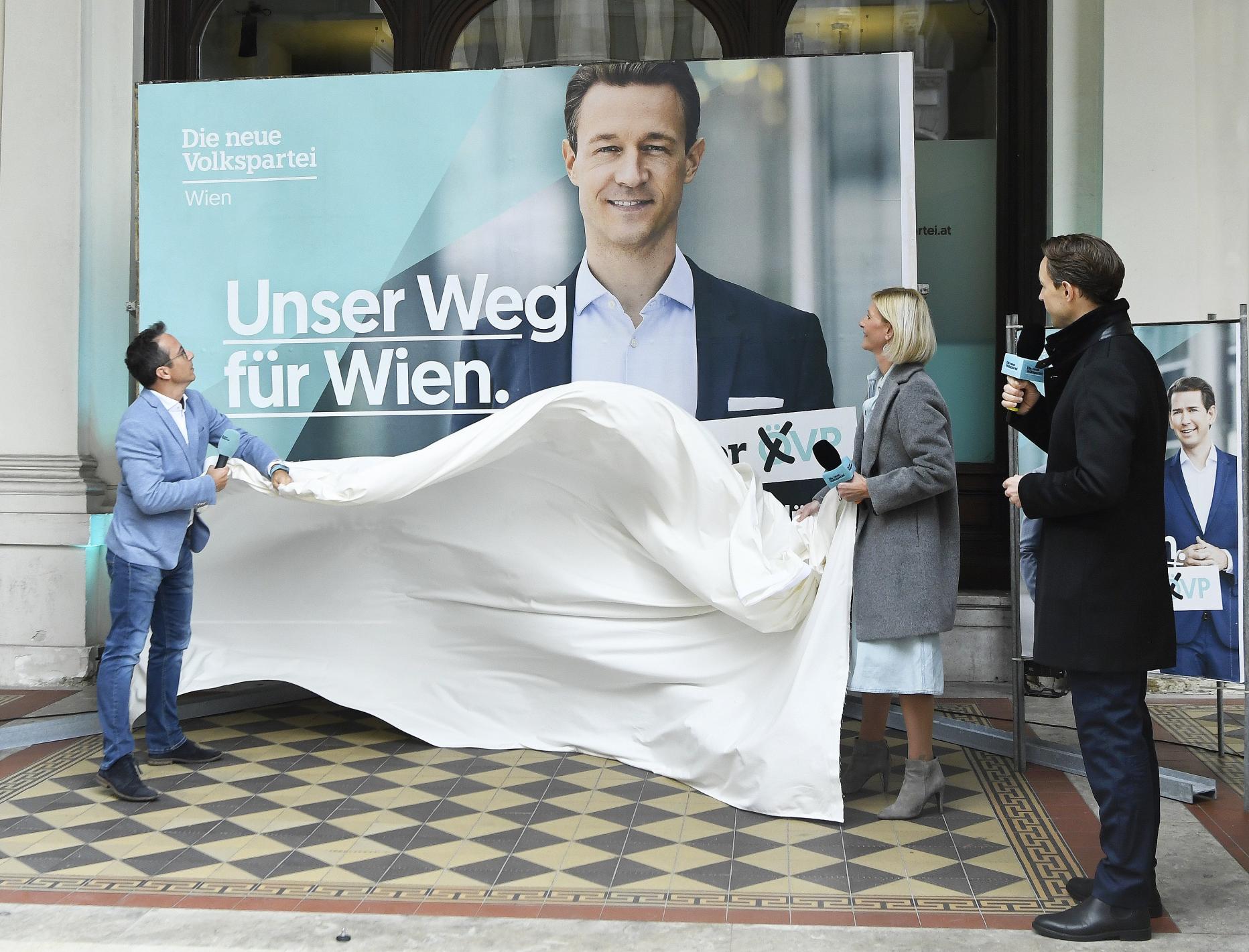 Auch Bundesparteichef und Kanzler Sebastian Kurz ist wieder an der Seite von Spitzenkandidat und Finanzminister Gernot Blümel zu sehen, wie sich bei der Plakatpräsentation am Dienstag zeigte.