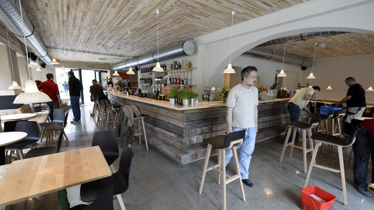Das kleine Café soll Angelpunkt für Austausch und Kommunikation werden. Hier, ebenso wie im gesamten Haus, hat das Architektenbüro „gaupenraub“ seiner Kreativität freien Lauf gelassen. 8000 alte Bretter aus zerlegten Obst- und Gemüsekisten bilden die Decke des Lokals. Die Theke wurde aus den alten Dachsparren gezimmert. Ausrangierte Türschnallen wurden zu Kleiderhaken umfunktioniert.
