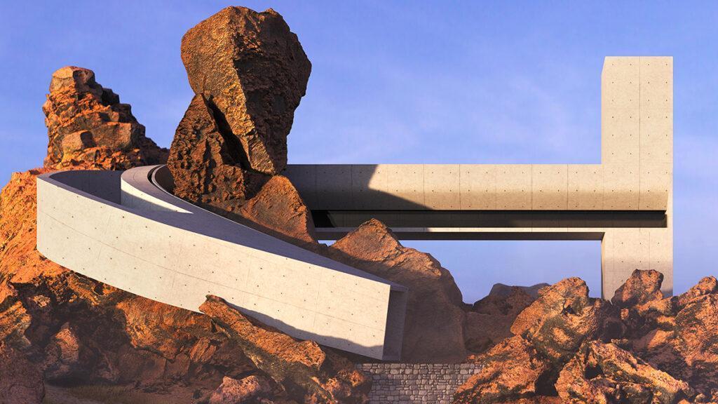 Mit seinem jüngsten Entwurf setzt der auf 3D-Renderings spezialisierte Architekt einmal mehr eine vom Menschen geschaffene Struktur in direkten Kontrast zur natürlichen Landschaft – und streicht damit vor allem diese Dualität hervor. Der architektonische „Eingriff“ windet sich beim Wüstenhaus um eine natürliche Felsformation. Er macht damit gleichzeitig auf die Beständigkeit der von der Natur geschaffenen Strukturen als auch deren Zerbrechlichkeit und Vergänglichkeit aufmerksam.