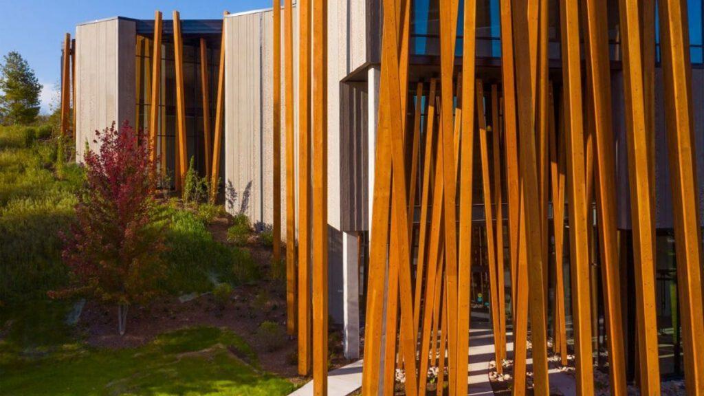 Besonders auffällig aber ist der künstliche „Wald“ durch den man das Gebäude betritt. Er schirmt die Sammlung vor der ständigen direkten Sonneneinstrahlung ab. Gleichzeitig blickt man vom Inneren des Museums durch den künstlichen Wald hinaus auf die das Gebäude tatsächlich umgebenden Bäume, auf den Fluss und die Wiese. So wird eine Verbindung geschaffen – der „Echo-Wald” geleitet einen hinein in das Museum.