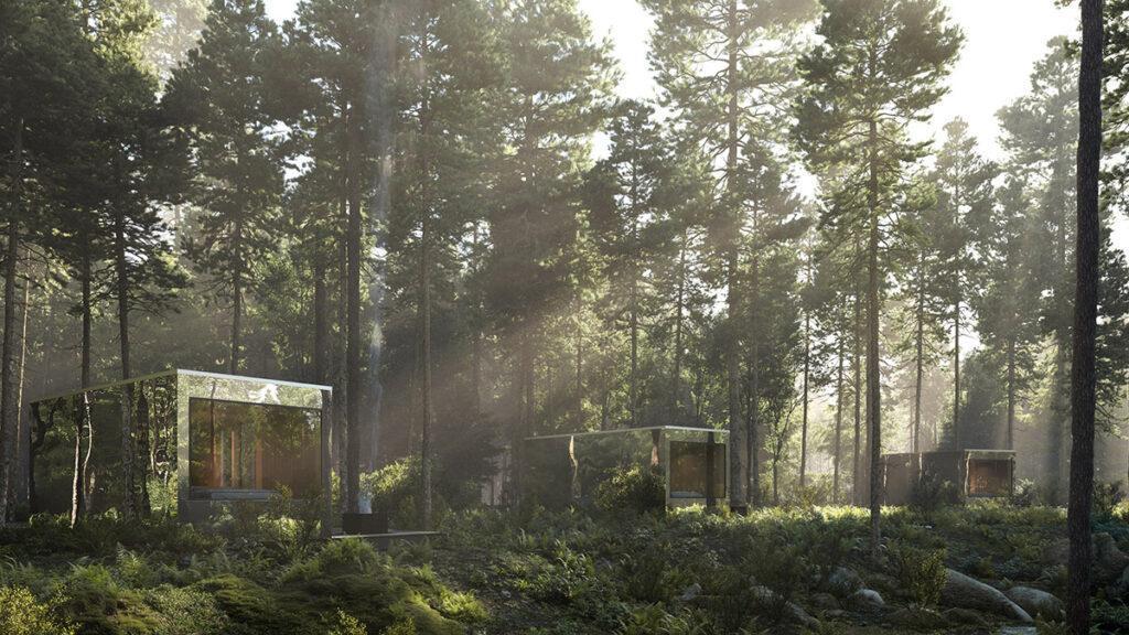 Errichtet werden die Arcana-Hütten auf ausgesprochen einfache Art und Weise: Ein Holzrahmen sorgt für Stabilität, die Verkleidung aus poliertem Edelstahl für den Spiegel-Effekt. Dieser wird zudem bewusst leicht verzerrt sein. So soll verhindert werden, dass Vögel versehentlich in die Fassade fliegen. Die Planer dazu: „Als eine Marke, deren Wurzeln im Respekt vor der Kraft und Schönheit der Natur liegen, war es eine Priorität, unsere Strukturen so zu gestalten, dass sie keine Gefahr für Vögel und andere Lebewesen darstellen, die im Lebensraum von Arcana leben.“