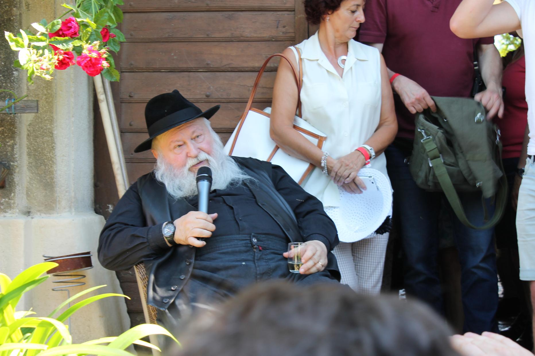 Nach einem ausgiebigen Buffet im Schlossgarten konnten die Atelierräumlichkeiten besichtigt werden und Nitsch hielt eine Ansprache. Er zeigte sich tief betroffen darüber, wie man in Österreich mit Künstlern umgehe, erinnerte daran, dass man ihn zu Beginn seiner Laufbahn sogar ins Gefängnis steckte. Gleichzeitig gab er auch zu verstehen, dass man ihn so einfach nicht unterkriegen könnte: "Das Fest ist noch lange nicht aus!"