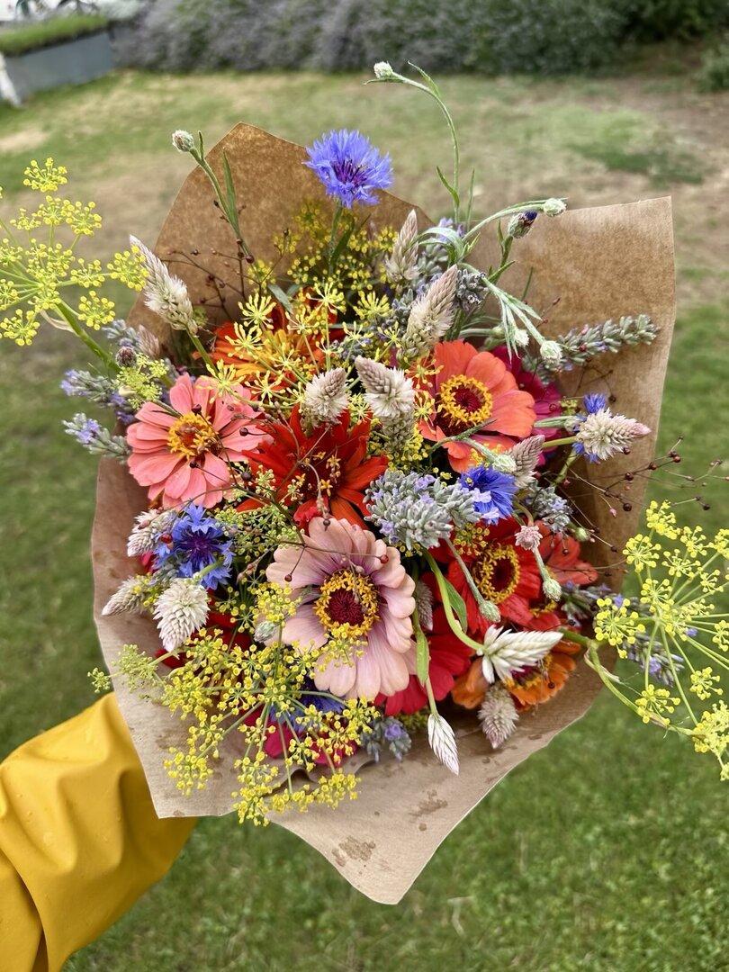 Vieles kommt aus dem Bauerngarten, der traditionell Blumen und Gemüse mischte. „Heute bevorzugt man zartere, pastelligere Farben als seinerzeit“, sagt die Gärtnerin, „man hat andere ästhetische Vorlieben.“ Das Beiwerk für ihre Sträuße findet sie überall im Garten: Brombeeranken, Hasellaub, Blütenstände von Dille und Fenchel. In jedem Strauß, den sie bindet, wird man immer die Jahreszeit erkennen können. Im Bild oben sind es die Boten des Sommers. Im Winter gibt es nur Trockenblumensträuße.