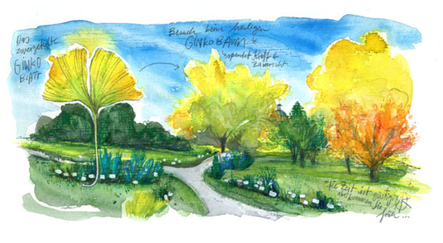 Ich erinnere mich daran, dass auch der große Goethe in seinem „West-östlichen Diwan“ dem Ginkobaum ein Gedicht gewidmet hat, das ich jetzt auf dem Handy aufrufe und leise murmelnd, aber doch vernehmlich ablese, als wäre ich ein Bauer, der um Regen bittet. Dabei würde ich lieber ein bisschen mehr Sonne bekommen.