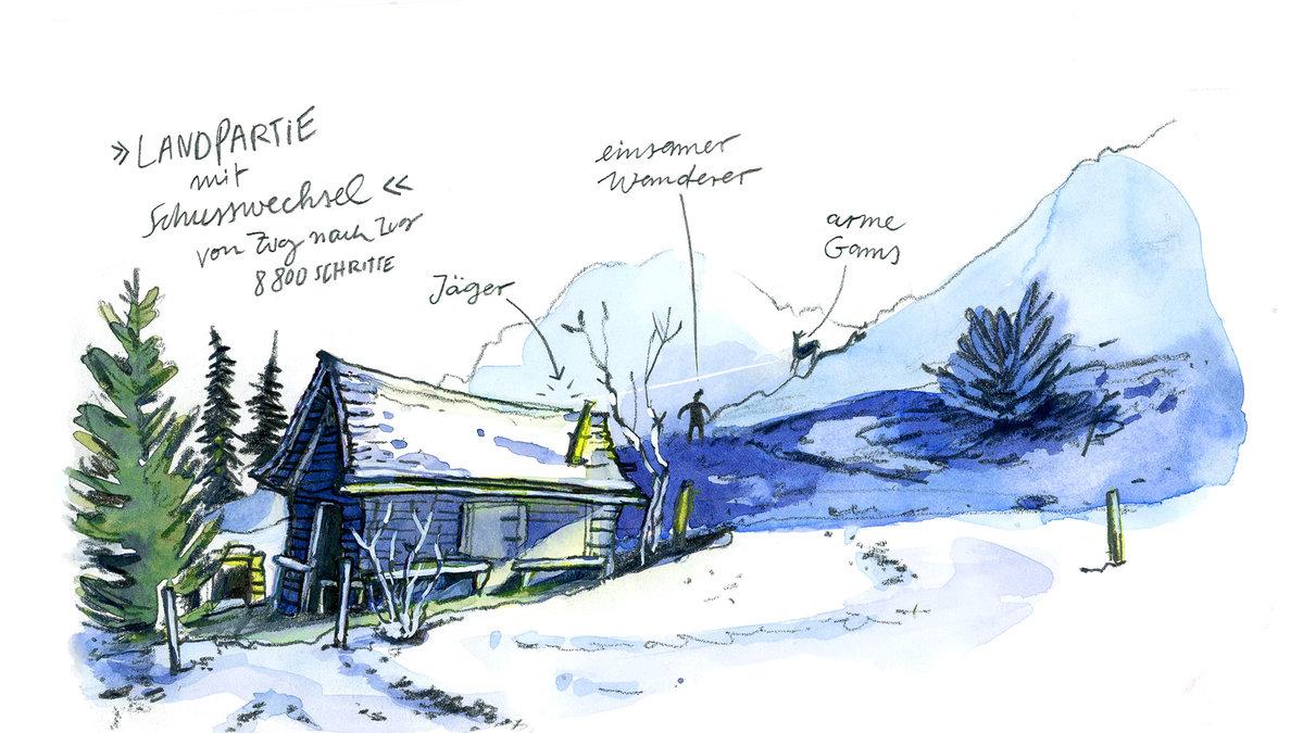 Die Melodie des Gehens, jetzt dissonant. Ich finde keinen Rhythmus mehr, weil ich einen Gang anschlage wie ein Mensch, der auf keinen Fall mit einem Hirschen oder einer Wildsau verwechselt werden will, hüpf, pfeif, schlender. Immer wieder sehe ich in den Rinnen, die vom Stierlochkopf und dem Unteren Schafberg hinunterziehen, Jäger in ihren Warnwesten stehen, und dann höre ich auch den kurzen Knall der Büchse, der sich in den Hängen des Arlbergs vervielfältigt und die Warnung vom Eingang bestätigt.