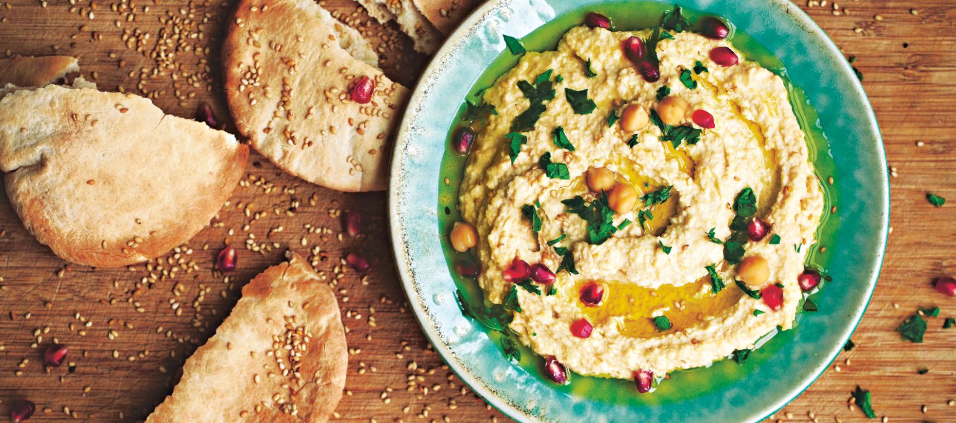 Kichererbsen über Nacht in viel kaltem Wasser einweichen. Am nächsten Tag das Wasser abschütten und die Kichererbsen mit frischem Wasser bedecken und 45 bis 60 Minuten kochen, bis sie weich sind. Dann abgießen (Kochwasser auffangen) und abtropfen lassen. Die abgetropften Kichererbsen mit den Gewürzen, der gehackten Knoblauchzehe, der Sesampaste, dem Öl und einem Schuss Kochwasser in die Küchenmaschine (den Mixer) geben und pürieren, bis eine feine Paste entstanden ist. Mit Kochsud verdünnen, bis die gewünschte Konsistenz erreicht ist. Mit Zitronensaft, Salz und Pfeffer abschmecken. Mit ein wenig Olivenöl, gehackter Petersilie, ganzen Kichererbsen und mit Granatapfelkernen garnieren.