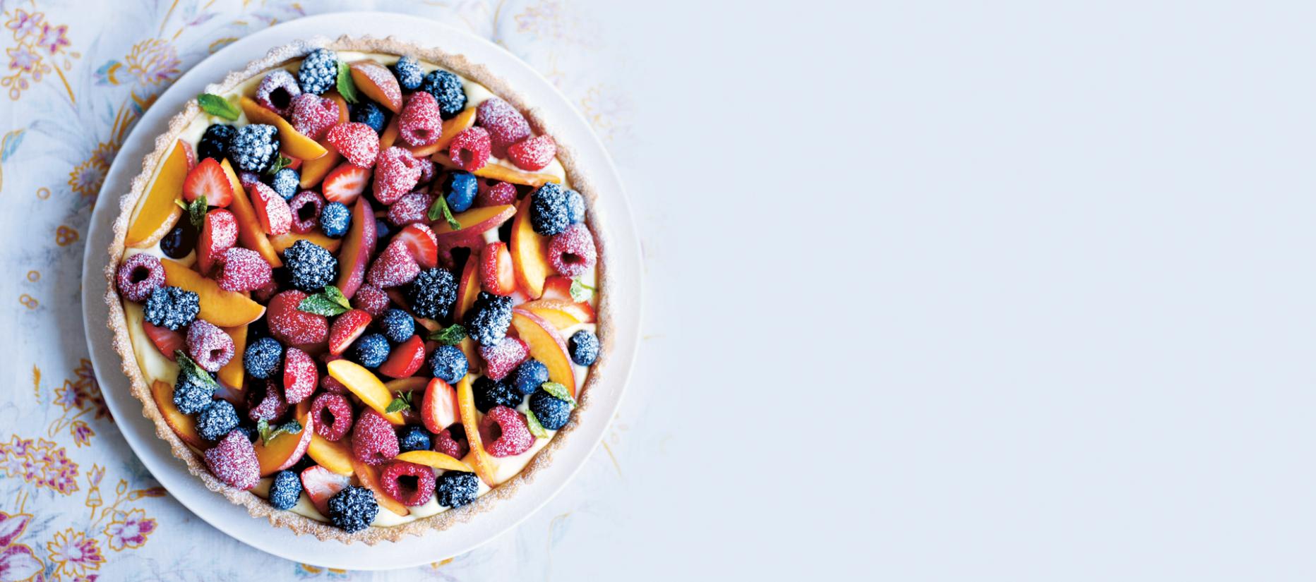 Obers steif schlagen und mit 300 g Vanillecreme vermischen. Auf dem Tarteboden glatt streichen, mit Obst und Minzblättchen belegen, anzuckern.