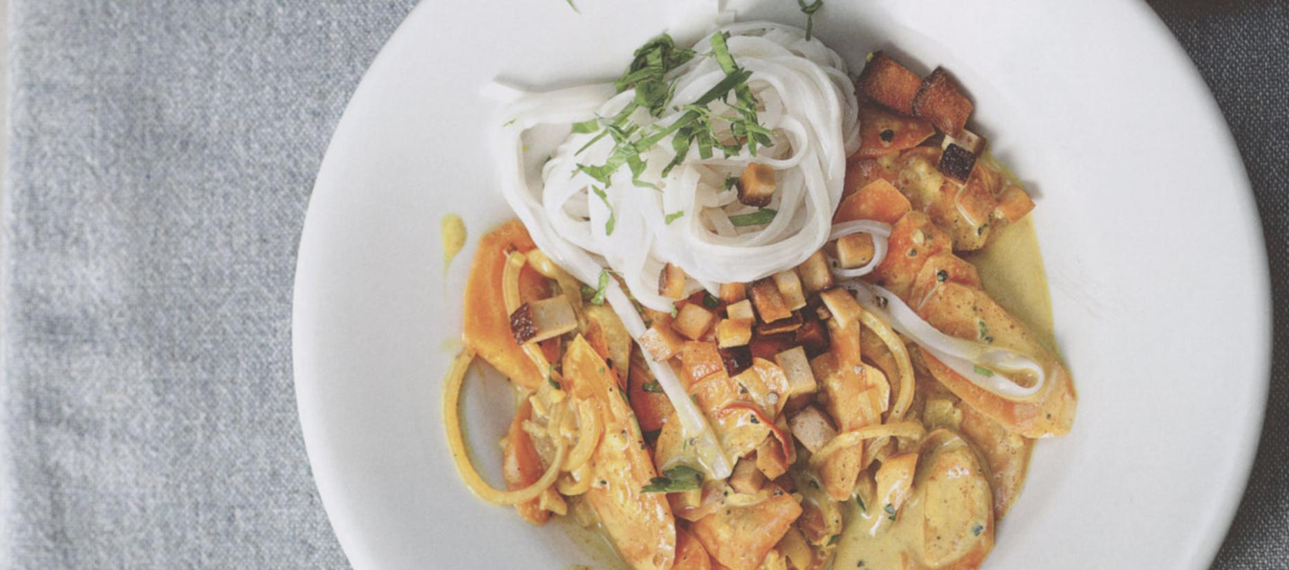 Knoblauch, Zwiebel und Ingwer schälen. Knoblauch und Ingwer feinhacken, Zwiebel in Ringe schneiden. Chilischote vom Stiel befreien, in feine Ringe schneiden. Karotten waschen, putzen, in dünne Scheiben schneiden. Petersilie waschen, trockentupfen, fein hacken. Tofu in dünne Scheiben, dann in Streifen und diese in Würfel schneiden.Reisnudeln nach Packungsanleitung in kochendem Salzwasser mit einem Schuss Öl etwa vier Minuten garen, abseihen, bis zum Gebrauch beiseite stellen.Restliches Öl in einem Wok oder einer großen Pfanne erhitzen. Tofu, Knoblauch, Zwiebel, Ingwer und Chili etwa 2 Minuten unter ständigem Rühren anbraten. Karotten zufügen, kurz mitbraten, mit Sojasauce und Reiswein ablöschen. Kokoscreme und Curry unterrühren, ca. 10 Minuten leise köcheln lassen, bis die Karotten gar, aber noch bissfest sind. Petersilie und Nudeln unterheben, mit Salz und Pfeffer abschmecken.
