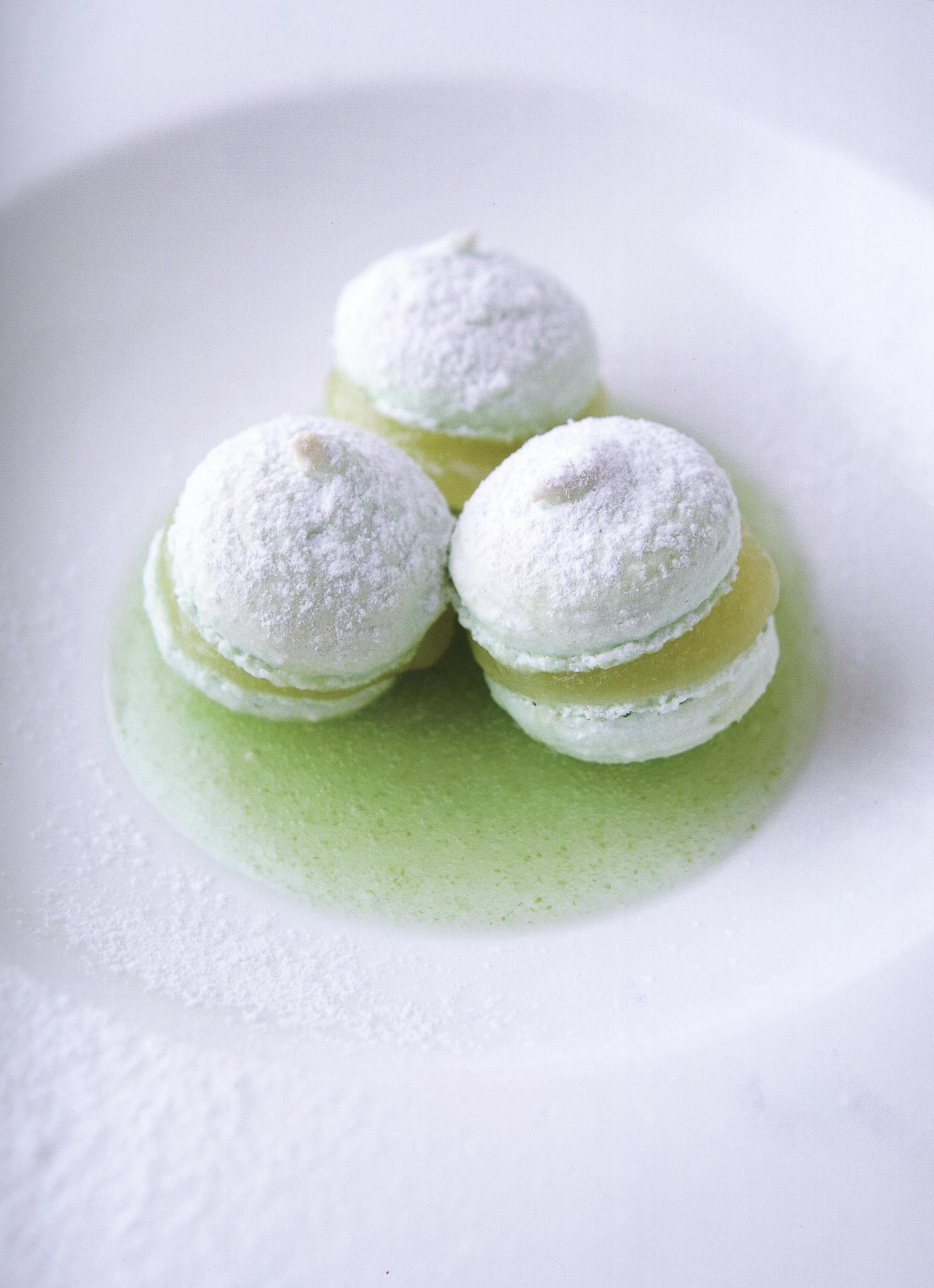Macarons kurz vor dem Servieren mit Apfelkompott füllen und auf einem Teller mit etwas Apfelsuppe anrichten.