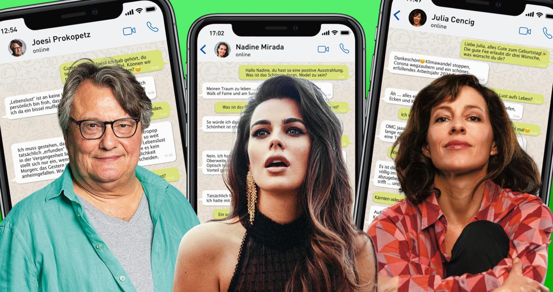Kabarettist Joesi Prokopetz, Topmodel Nadine Mirada und Schauspielerin Julia Cencig im etwas anderen Interview - als WhatsApp-Chat.