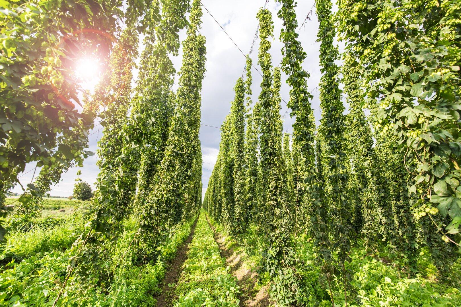 Reihen von hohen, dicht bewachsenen Hopfenpflanzen wachsen auf einem sonnigen Feld.