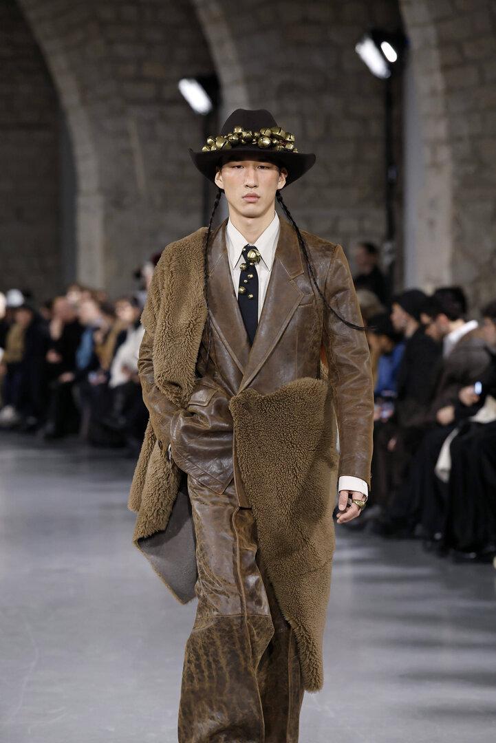 Der Modeschöpfer dachte bei der Kreation der Kollektion an asiatische Cowboys, sagte er und versinnbildlichte die Inspiration in Form von Frisuren mit links wie rechts baumelndem Flechtwerk à la Heidi oder nach hinten gelagert wie bei Oma.