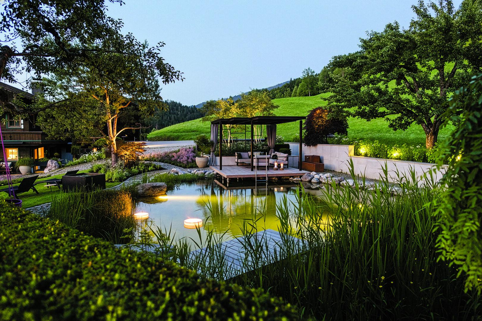 Wasser- und Lichtspiele im ehemaligen Bauerngarten in Kufstein: die Spiegelungen auf dem Schwimmteich sorgen für Stimmung, die Pergola für ein modernes Ambiente (auch am Foto ganz oben)
