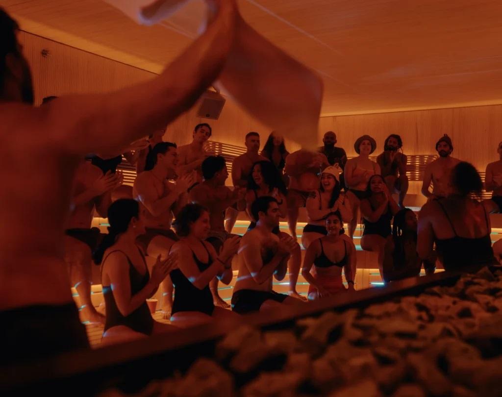 Dampfwolken hängen in der Luft, dazwischen dröhnt ein DJ-Set, Menschen in stylishen Badehosen und Bikinis sitzen schwitzend nebeneinander und unterhalten sich, neben den Abkühlbecken tanzen die Gäste.