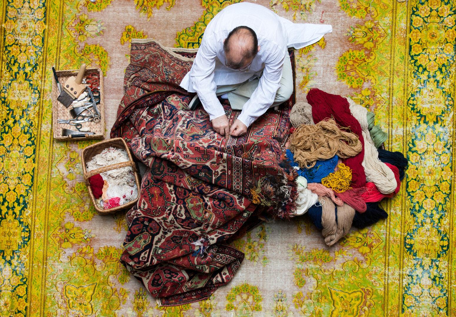 Vor ihm lehnt ein Holzrahmen, in den ein etwas devastierter Perserteppich eingespannt ist. Faden für Faden spannt er mit einer Häkelnadel in ein Raster und flickt das kleine Malheur, als würde er dem Teppich die Seele zurückgeben. Mit einem Kamm zurrt er die Fäden fest, millimetergenau, sodass am Ende wieder dasselbe Muster wie zuvor erscheint.