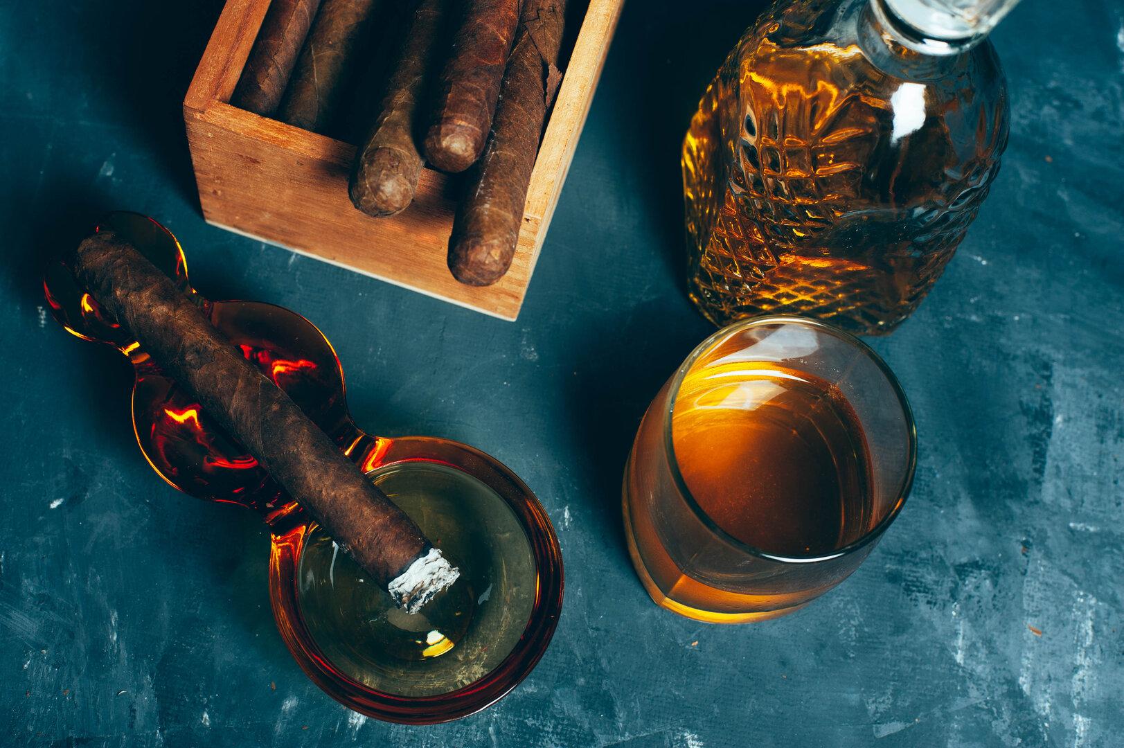 Eine brennende Zigarre liegt in einem Aschenbecher neben einem Glas und einer Karaffe mit braunem Getränk sowie einer Zigarrenkiste.