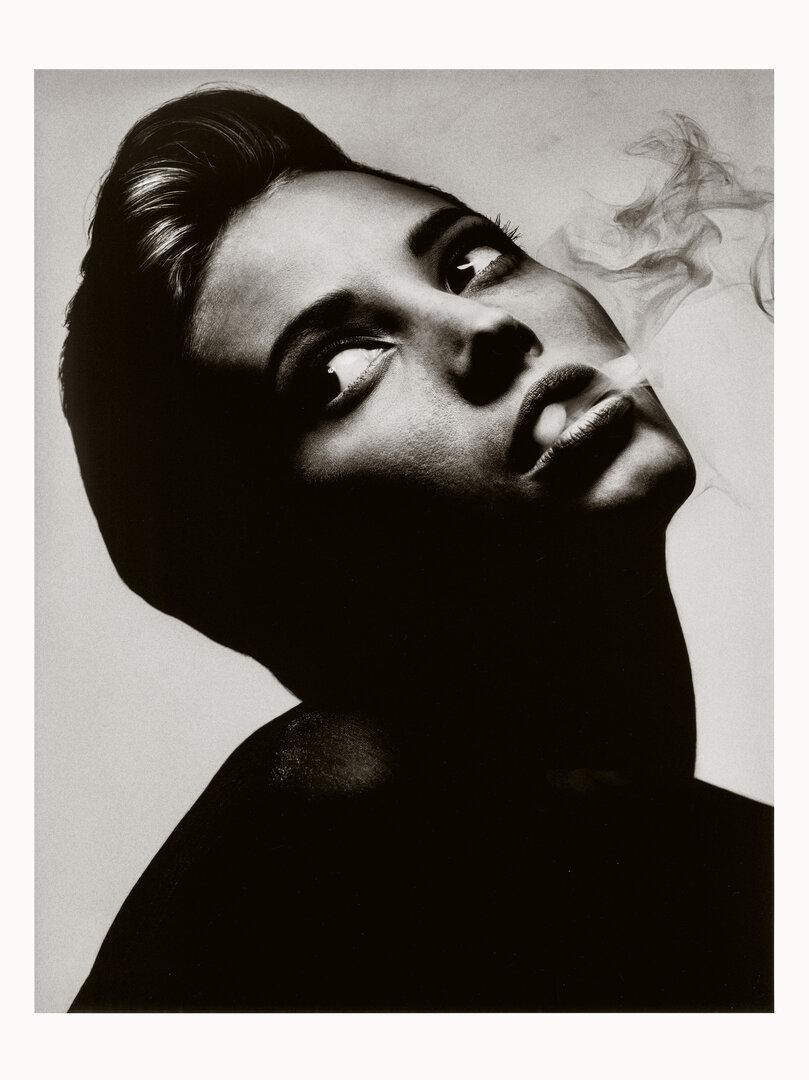 Mick Jagger mit Leopardenkopf als Doppelbelichtung, Mike Tysons Stiernacken, Steve Jobs mit stahlhartem Adlerblick, Jude Law als weichgezeichneten Teenieschwarm. Und selbstverständlich jede Menge Supermodels: Cindy Crawford, Adriana Lima, Rachel Williams, Yasmeen Ghauri. Kate Moss, nackt. Oder Christy Turlington, in einem Meisterwerk der Komposition, das Antlitz halb ins Dunkel, halb ins Licht getaucht, den Kopf nach hinten gelegt, die schweren Augen suchen nach einem mysteriösen Punkt fern unseres Blickfelds, während Rauch aus ihrem Kussmund qualmt, als hätte sie gerade eine Gewehrkugel mit dem Mund gefangen – ein letzter Seufzer?