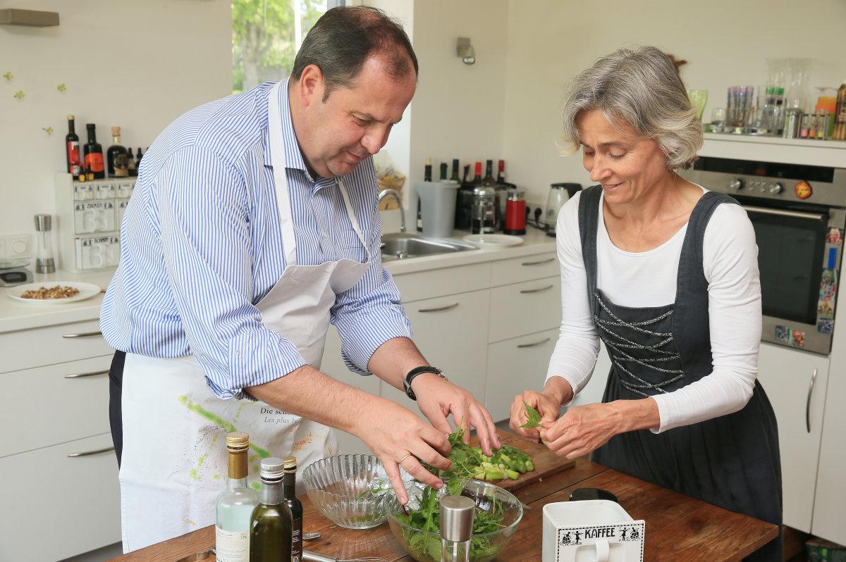 Ehrlich gesagt konnte ich die Kochkünste des Josef Pröll gar nicht einschätzen. Nur, dass er gerne isst, das wusste ich von früheren Begegnungen in seiner Funktion als Landwirtschaftsminister. Sicherheitshalber erkundige ich mich bei einem meiner Lieblingsköche – Georg Kruder aus Zistersdorf – nach einem passenden Maibockrezept und stelle mich seelisch darauf ein, es wohl auch selbst umzusetzen. Auf die Minute genau läutet der Landesjägermeister, die Zutaten bringt er in zwei Sackerln mit. Vakuumierte, ausgelöste Rehrücken samt Mini-Lungenbraten, grüner Spargel, Walnüsse, Nussöl. Alles aus dem Weinviertel. Die (Un-)Kräuter für den Salat pflücken wir im Garten. Kurze Rezeptbesprechung, Pröll macht sich an die Arbeit. Spargel schälen. Nicht eine Spitze bricht ab. Nüsse aufschlagen. Eine springt vom Tisch, er hebt sie sofort auf. „Nichts vergeuden, was die Natur verschenkt.“ Die Schalen wirft er in den Holzofen. Ran ans Fleisch. Pröll streicht die zarten Rücken mit Gewürzen ein. Begeistert erzählt er von seinem Grillkurs bei Adi Matzek in Horn, nebenbei bekomme ich eine kleine Einführung in die Wildsprache. Das männliche Wildschwein heißt nicht Eber, sondern Keiler. Und: „Der Vater vom Reh ist nicht der Hirsch“. Nach dem Nussrösten reiche ich ihm eine Pfanne für das Fleisch. Er schaut mich fragend an und beschließt, die Nusspfanne weiterzuverwenden. „Es warad wengan abwaschn.“