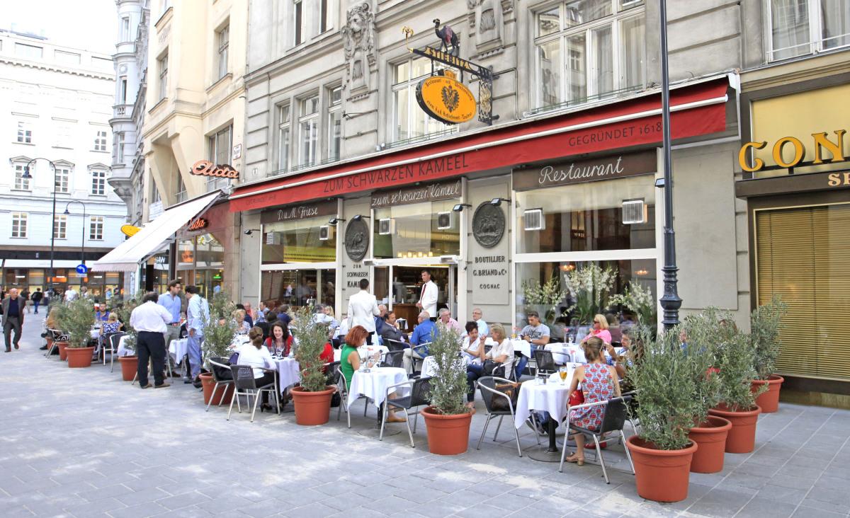 10 Uhr Bognergasse, Zum Schwarzen Kameel. Jeder Tisch im Schatten ist besetzt, die Jalousine reicht nur für die erste Reihe. Ein Kellner eilt vorbei, keine Hilfe in Aussicht. Die Kundin tritt ins tradionsreiche Restaurant, der zweite Kellner vertröstet und meint, in wenigen Minuten wird sicher ein Tisch frei. Ein absolutes Novum: Draußen sitzen tatsächlich Frühstücker. Angesichts der neuen Konkurrenz durch das Park Hyatt öffnet das 400 Jahre alte Unternehmen seit Kurzem auch sonntags seine Pforten und bietet täglich bis 11 Uhr Frühstück an.