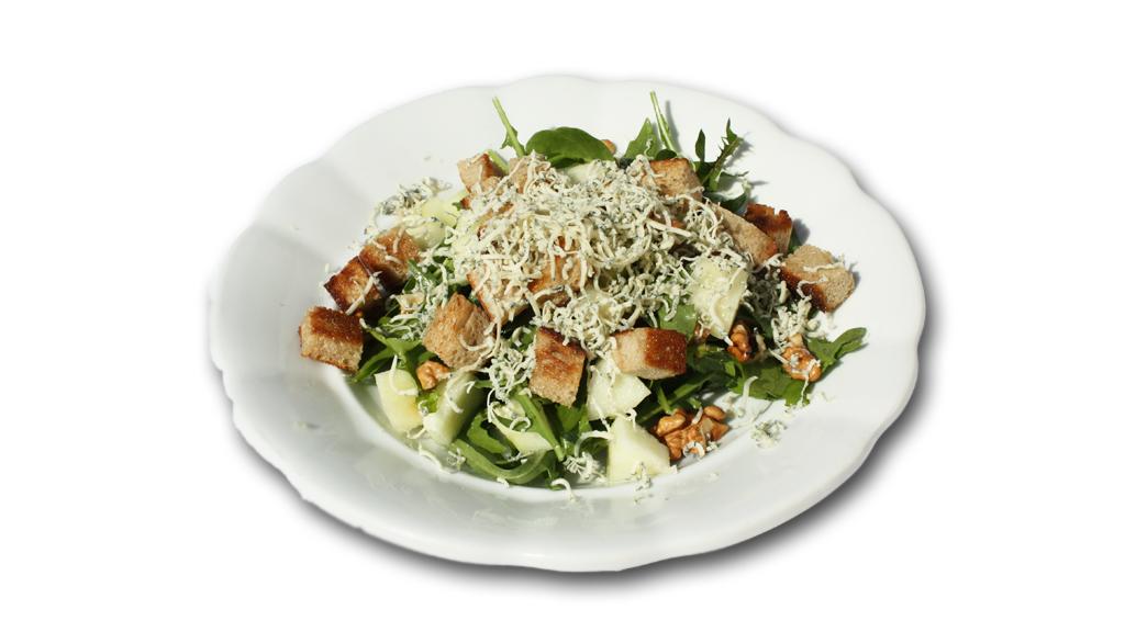 Das Brot entrinden und in 2-cm-Würfel schneiden. 1 EL Öl in einer Pfanne erhitzen, die ungeschälte, angequetschte Knoblauchzehe und das Brot darin knusprig braun braten. Leicht salzen. Salat waschen und trockenschleudern, Birne entkernen und würfeln. Nüsse aufschlagen und auslösen. Je 2 EL Essig und Öl, Salz und Pfeffer versprudeln, Salat, Birne und Walnüsse damit vermischen. Anrichten. Die warmen Croutons darauf verteilen, den Käse mit einem Krenreißer drüberreiben.