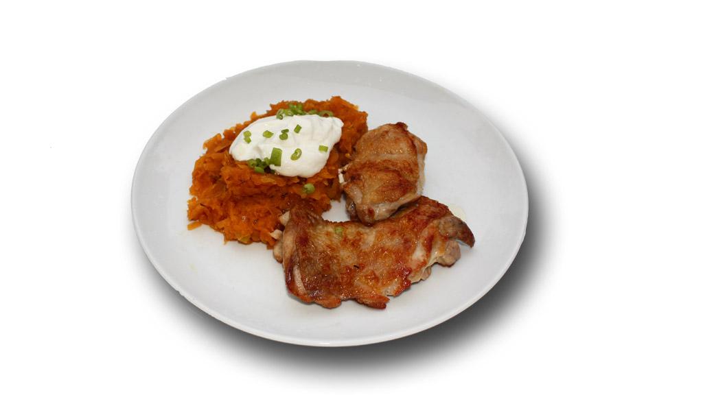 Hühnerkeule am Gelenk durchschneiden. Oberkeule auf der Innenseite längs des Knochens einschneiden, Knochen herauslösen. Bei der Unterkeule die Haut an der schmalsten Stelle rund um den Knochen einschneiden, weiter wie vorher. Eine beschichtete Pfanne erhitzen. Fleisch salzen, auf der Hautseite einlegen, 5-7 Minuten knusprig braten, umdrehen, auf der zweiten Seite bei milder Hitze 7 Minuten fertig garen. Kürbis schälen, grob raffeln, Zwiebel und Knoblauch klein schneiden. Zwiebel in 1 EL Öl anschwitzen, Kürbis und Knoblauch dazu. Mit Paprika und Kümmel würzen, mit einem Schuss Wasser und einem Spritzer Essig aufgießen, köcheln lassen. Kürbis mit einem Klecks Sauerrahm anrichten, Zwiebelgrün drüberstreuen, Huhn dazulegen.