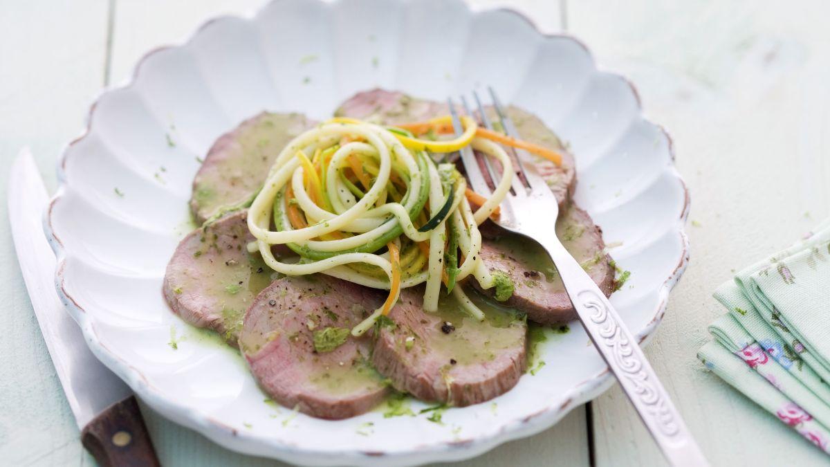 Filetscheiben leicht überlappend kreisrund auf einen Teller legen und mit Salz, undPfeffer würzen. Gemüse-Linguini mit einer Fleischgabel aufrollen und in der Mitteverteilen. Alles mit der Sauce beträufeln.