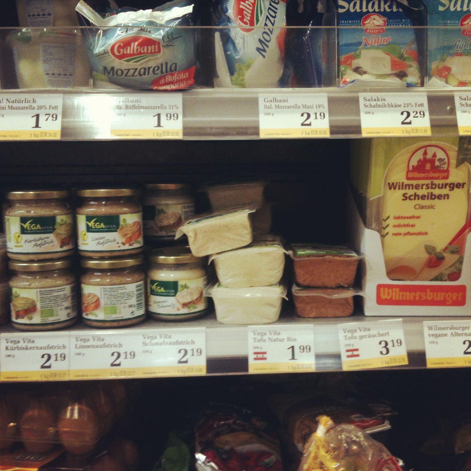 In der Billa-Filiale bei mir in der Nähe wurde das vegane Angebot im Kühlregal erweitert. Da gibt es plötzlich veganen Schmalz-, Linsen- und Kürbiskernaufstrich und veganen Käse von Wilmersburger neben Tofu und Hummus.