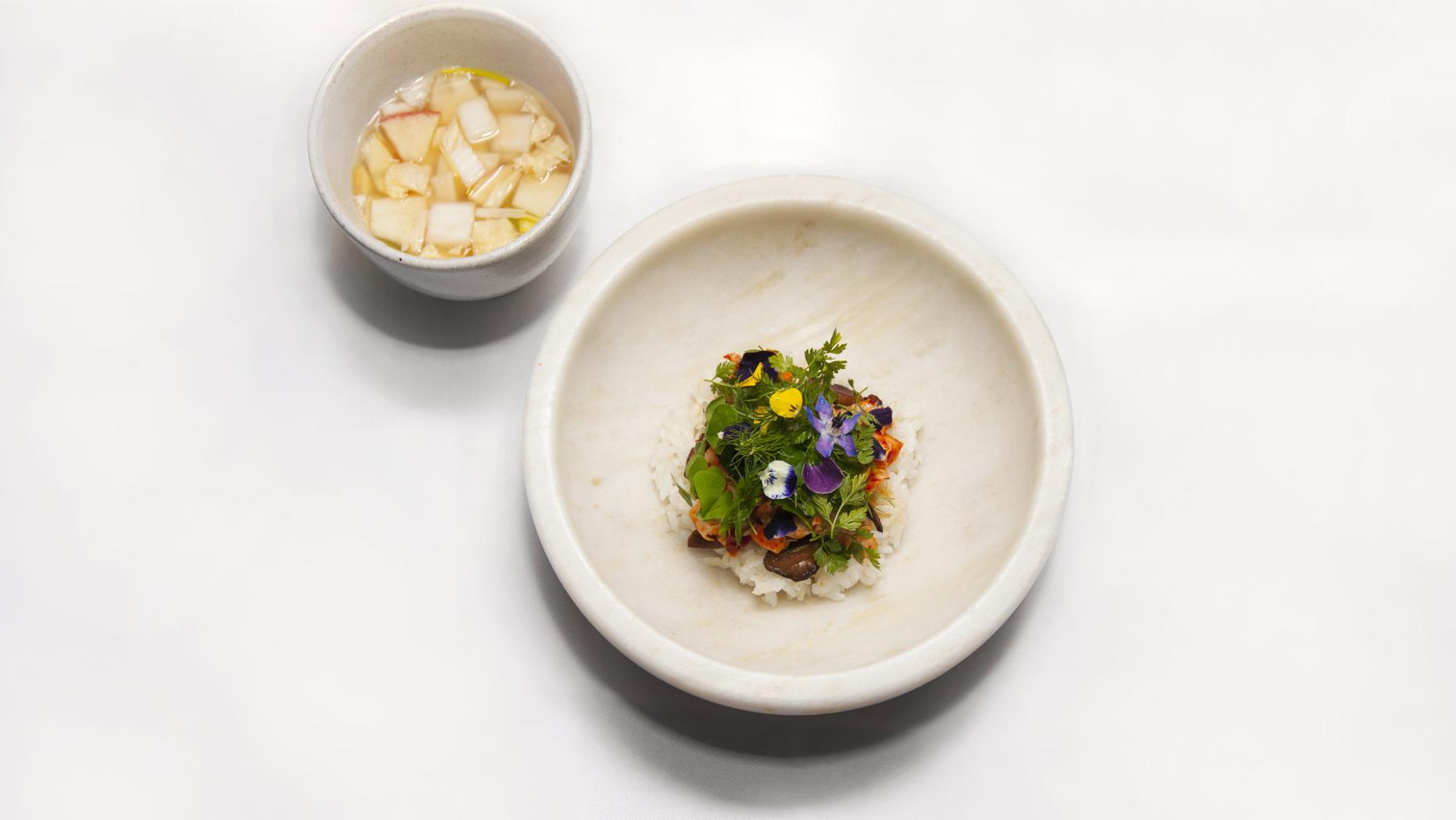 Die jungen, südkoreanischen Küchenchefs, die kürzlich in der Küche von Konstantin Fillipous Hauben-Restaurant koreanisch kochten, haben die Übersetzung wörtlich genommen: Sie servierten ihre Variation des traditionellen Reisgerichts namens Hwaban dekoriert mit bunten, essbaren Blüten und zweierlei Kimchi.